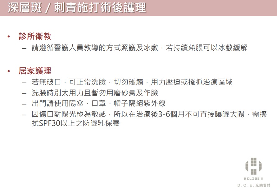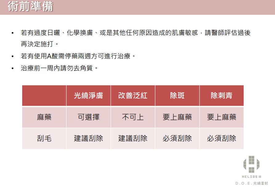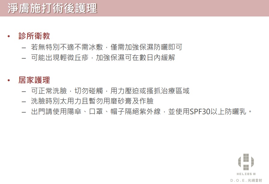 術前須知: 1.若有過度日曬或是肌膚敏感的狀況,請務必告知診所人員,肌膚過度日曬過後黑色素細胞較為活躍,此時進行治療可能容易造成色素沉澱,請告知診所人員讓醫師評估適不適合進行療程喔! 2.若在療程前三天有進行去角質的動作,請務必告知診所人員,角質層具有保護肌膚的作用,若在施打前幾天有進行去角質或果酸換膚,請讓醫師評估是否需要調整劑量。 3.請主動告知診所您的藥物使用狀況,有些藥物會影響雷射治療的結果,請務必主動與醫師討論您的用藥狀況以達到最安全的雷射治療。 4.請完整卸除您臉上的彩妝,避免影響雷射能量傳遞。
