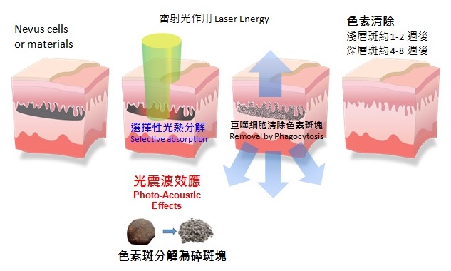 利用光震波效應+選擇性光熱分解效應,超高瞬間能量將目標黑色素斑塊擊碎分解,再配合巨噬細胞代謝黑色素斑塊,達到淡化斑點功效。