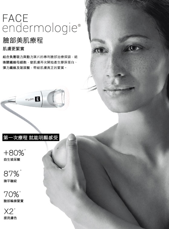 一次療程 即可看見效果 結合負壓吸力與動力葉片的專利臉部治療探頭,endermologie臉部療程能喚醒纖維母細胞,使肌膚再次開始產生膠原蛋白、彈力纖維和玻尿酸,使肌膚達到真正的緊實。