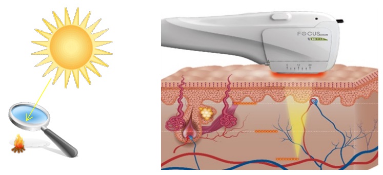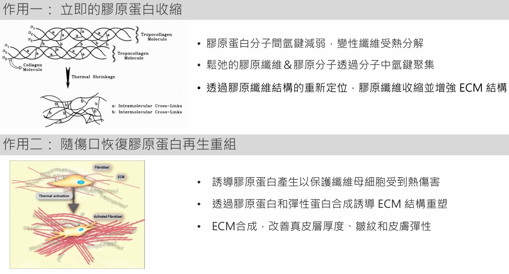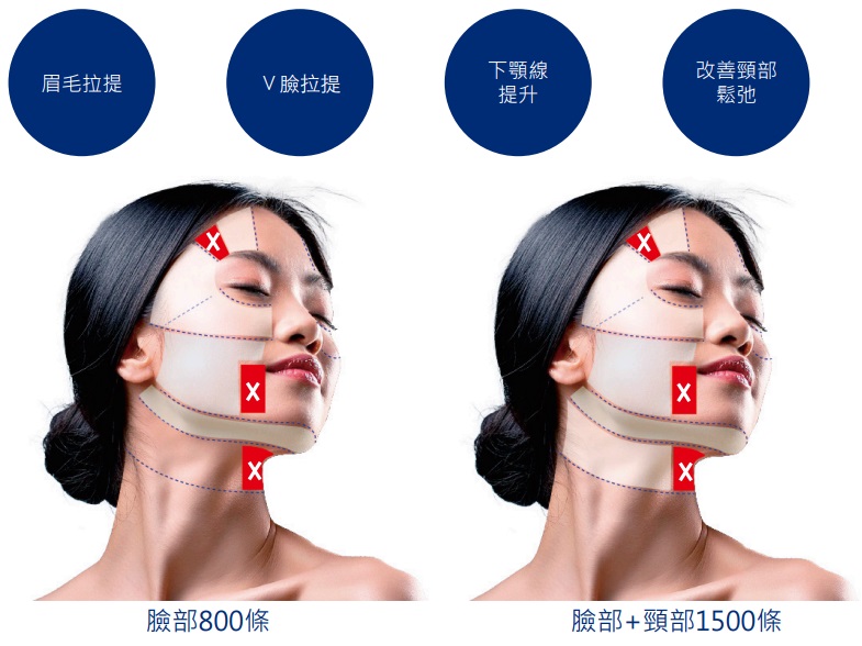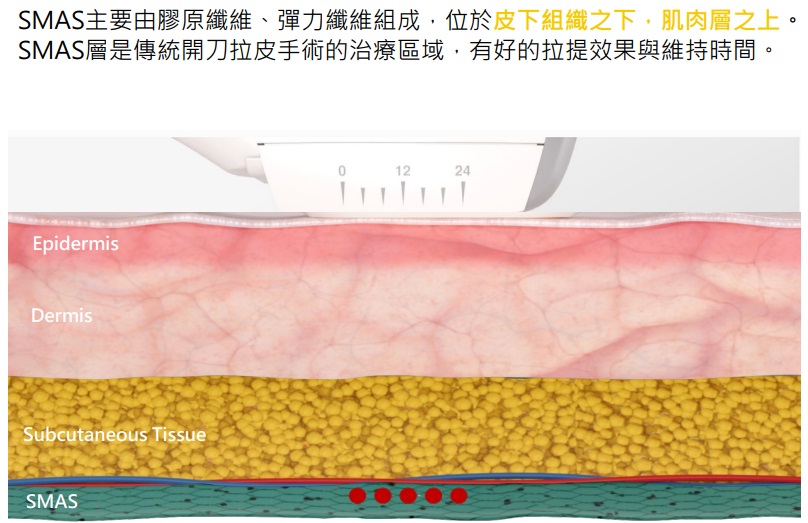 通過4MHz和7MHz的高能聚焦超音波,透過表皮,在皮膚深層形成60~70°C的熱凝結點,使得SMAS(筋膜層)立即收縮,達到皮膚緊緻拉提的效果。