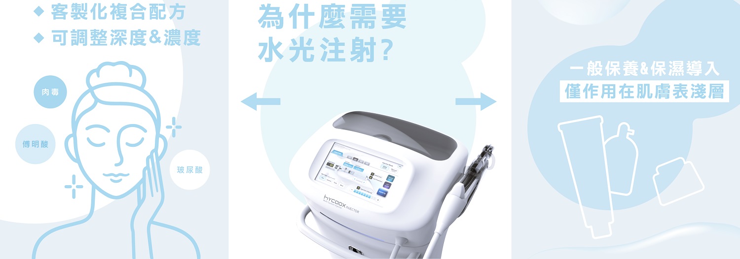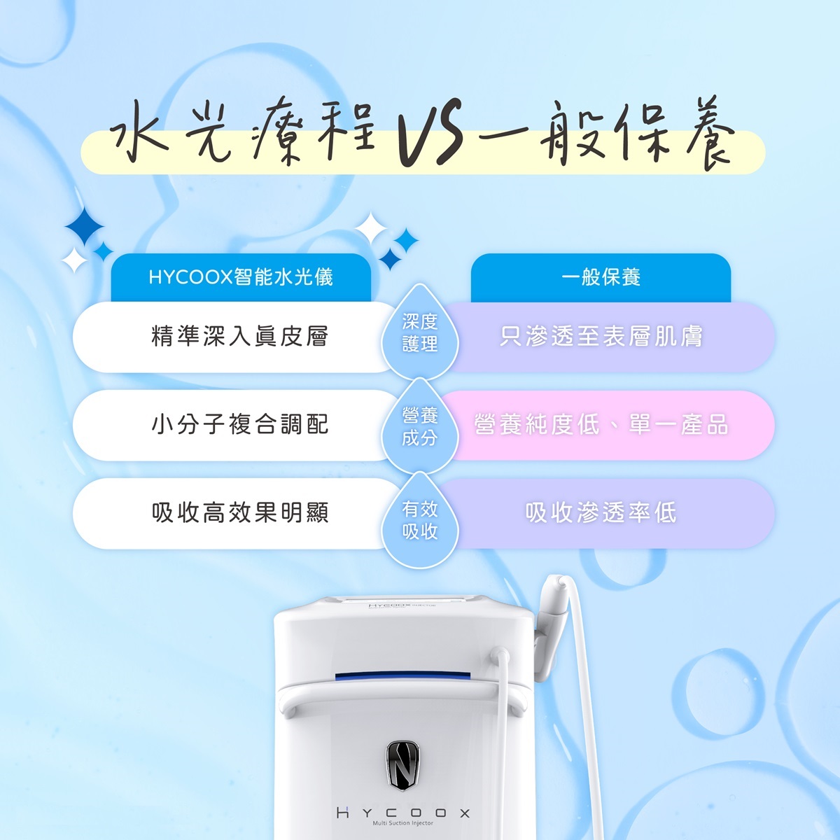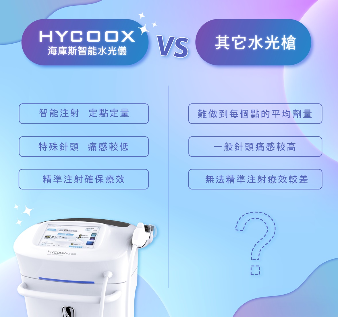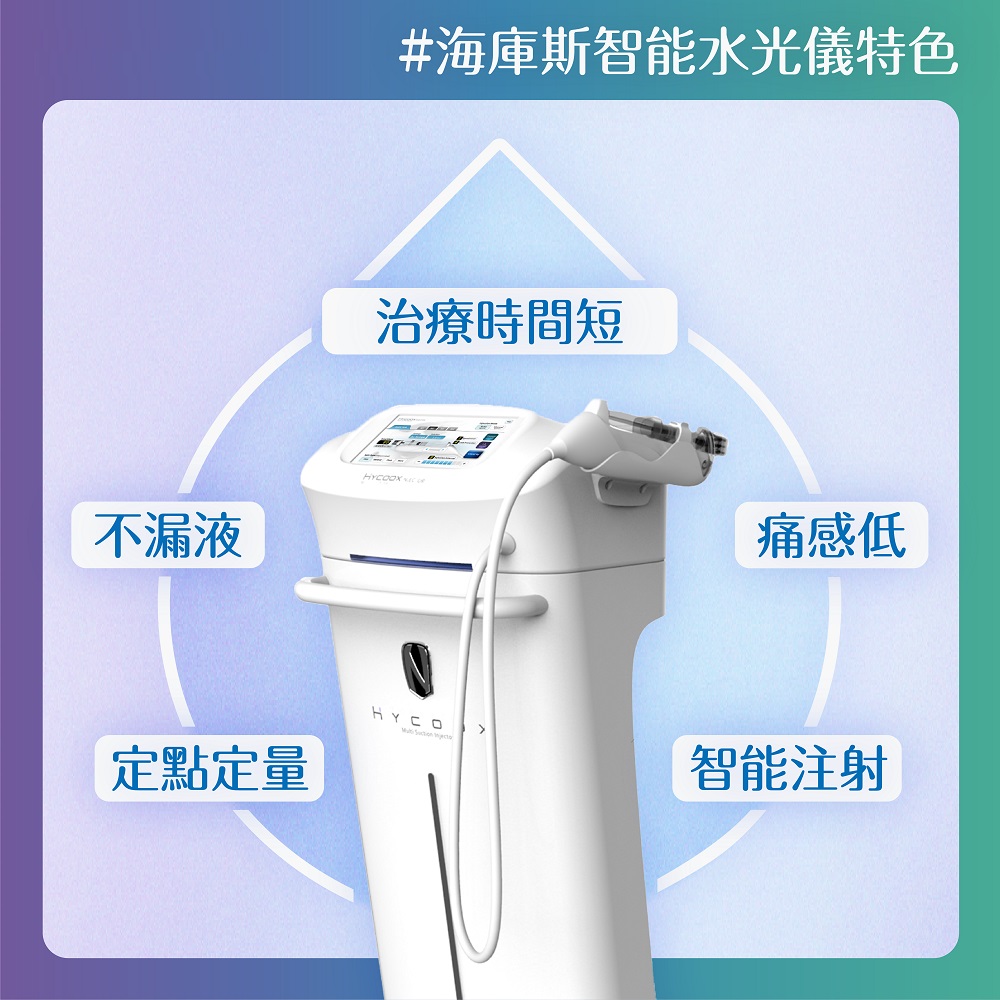 HYCOOX海庫斯智能水光儀 俗稱「水光槍」或「水光針」,通過台灣衛福部認證,配有高科技感知負壓自動注入系統,可依每個人的膚質情況及施打的部位。將玻尿酸與藥劑精準的注射進真皮層,同時保施補水、滋潤角質層、收縮毛孔、袪除皺紋,再現肌膚青春。