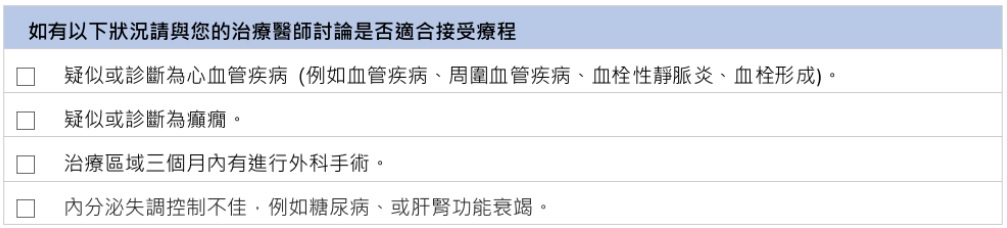 哪些族群不建議治療? 裝有心律調節器、植入去顫器、任何主動式植入物及金屬植入物的患者。