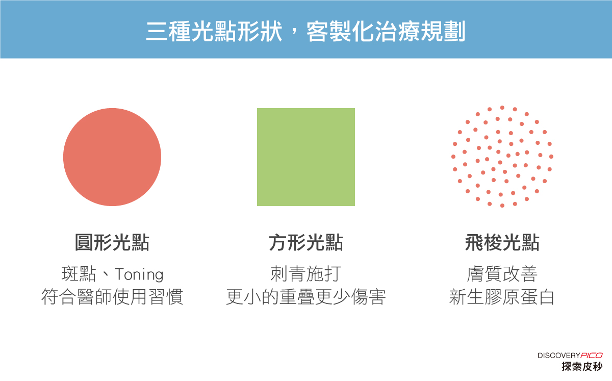 與前任男/女朋友分手後,留下的相愛印記怎麼辦? 刺青移除: 皮秒在治療黑色素的效能本來就很好,且雙波皮秒有著1064nm與532nm二種波長,多色刺青涵蓋範圍廣,所以應用在清除單色(多色)刺青上的表現,也是優等生呦! 三種光點形狀 刺青客製化治療規劃 圓形光點:斑點、Toning符合醫師使用習慣 方形光點:刺青施打,更小的重疊,更少傷害 飛梭光點:膚質改善,新生膠原蛋白