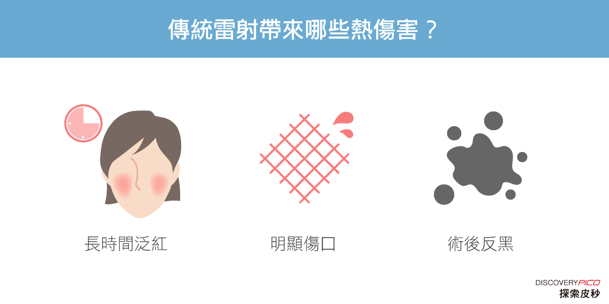 →1.以汽化方式由外內破壞疤痕組織。 →2.利用熱能刺激膠原蛋白新生來治療凹圖疤痕,在臨床上約有20%機率會產生紅腫及反黑。 【探索皮秒】