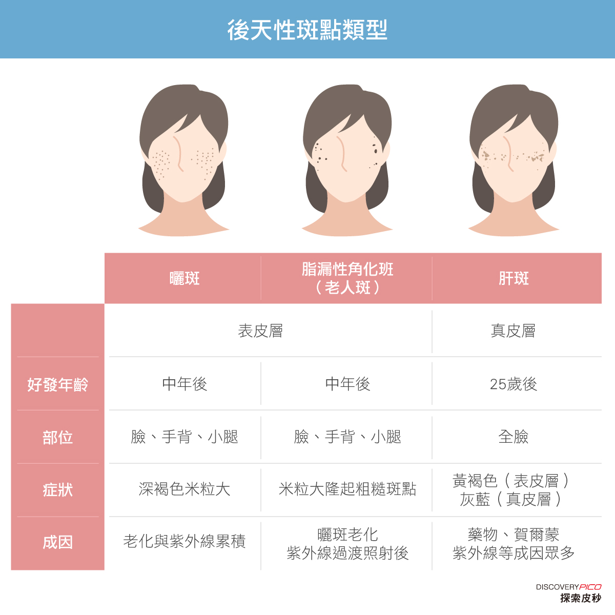 後天性斑點類型:曬斑、老人斑、肝斑。