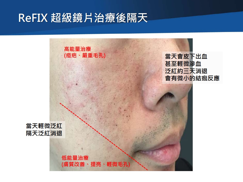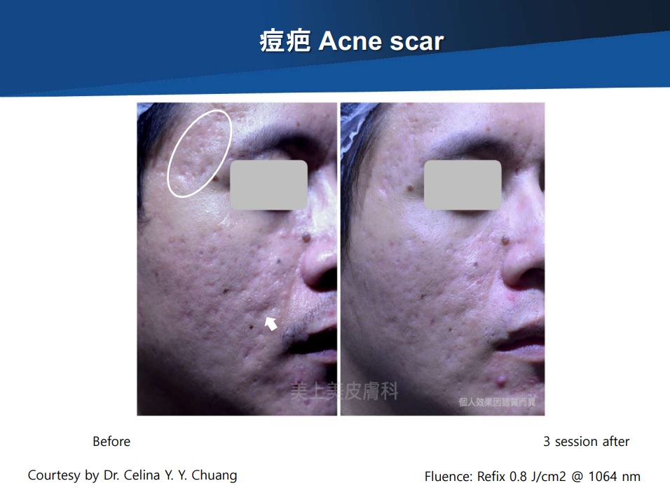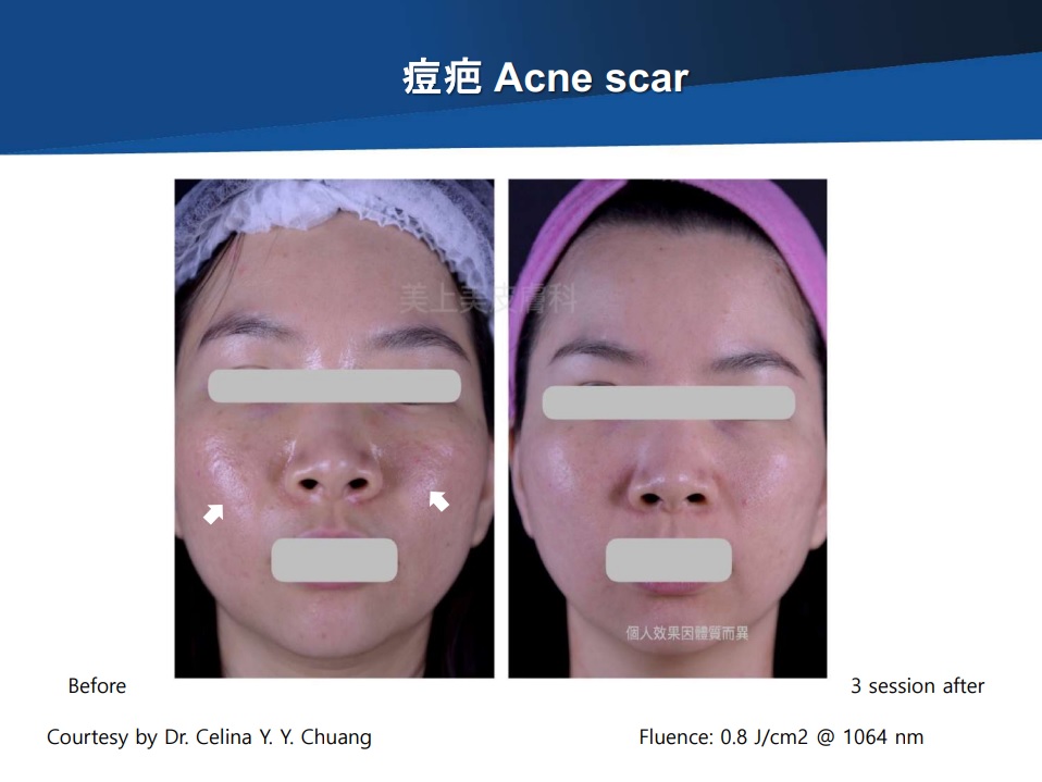 →1.以空泡化效應由內而外破壞痘疤下的纖維化組織細胞。 →2.利用皮秒所產生的小空泡,啟動肌膚新生,重新激活膠原蛋白,改善腦人凹凸疤痕。經臨床醫師回饋,術後產生紅腫及反黑副作用約<1%。
