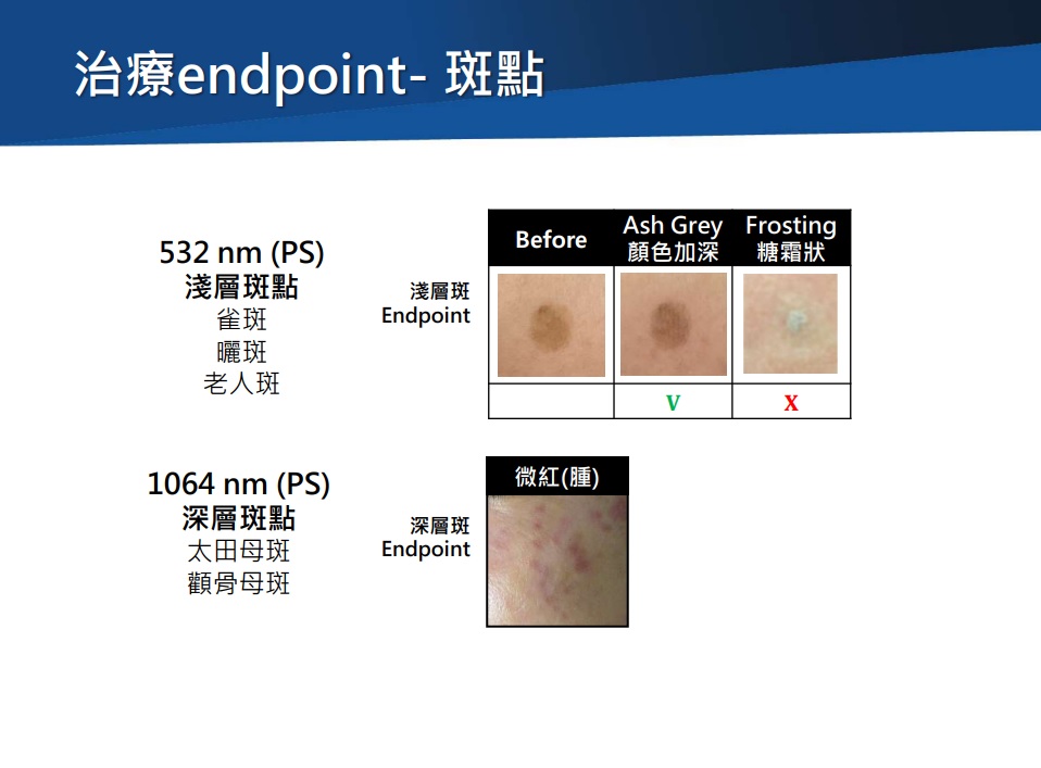 治療當天的準備: 治療前不需要特別的術前保養,但若有使用藥物,請告知您的醫師並和醫師討論停藥的必要性以及時間。療程進行前請將臉上的彩妝以及保養品徹底卸除,並請務必確認您的所有疑問都已經和醫生討論並獲得滿意的解答。 肝斑僅能淡化以及延緩復發,無法根治,請與您的醫師討論是否需要合併其他治療,在專業醫師的協助下達到最佳的治療效果。 探索皮秒雷射 術後注意事項: