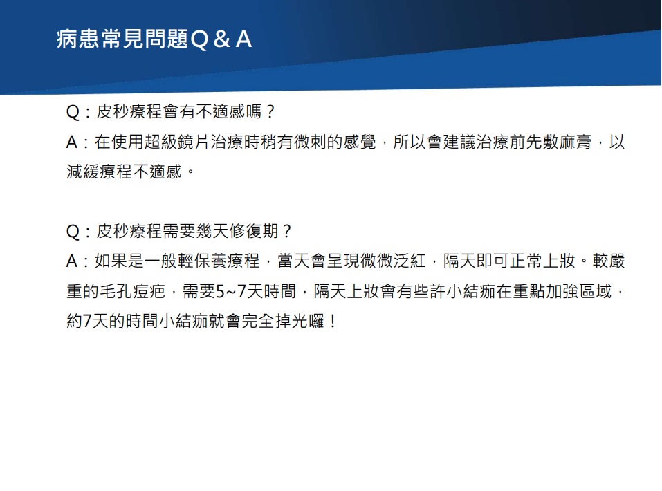 常見問題Q&A Q1:治療時會不會很痛? A:雷射擊發瞬間會有些微的刺癢感,在治療後僅有些微的熱脹感,大約在療程後一小時臉上微紅的狀況就會消失,請毋須過份擔心。因個人體質差異,退紅時間將略有不同。 Q2:如果覺得痛可以塗麻藥嗎? A:為療程舒適度及減低客戶緊張感,可視情況敷上表皮麻藥。但是,若是想要做肝斑術區表淺微血管的抑制,會因為麻藥導致血管收縮因而無法達到良好治療效果。治療前請與您的醫師討論是否需要使用。 Q3:會不會有副作用? A:雷射除斑可能出現之副作用為術後色術沉澱,雖然副作用出現的機率與施打的劑量有相對關係,但根據個人體質不同,副作用出現的機率也會有所差異。 Q4:治療後會有什麼反應? A:在治療後肝斑區域可能會呈現些微泛紅的狀況,請按照醫師建議方式照護。 Q5:什麼時候看得到效果? A:因個人治療的範圍以及嚴重程度皆有不同,屆時可能需要不同的療程次數,一般來說療程需要4-7次,建議每次治療間隔為4-6週。施打過後治療區域僅會呈現些微泛紅的情況,但每一次療程後您都可以感受到改善。建議與您的醫師討論並擬定最理想的治療計劃。 Q6:我適合接受探索皮秒雷射的肝斑治療嗎? A:若您有下列症狀,請和您的醫師討論後再決定是否進行治療喔! ►首先最重要的第一步驟是徹底清潔肌膚。 ►術前足夠的保濕能夠幫助舒緩熱刺激,降低熱能對皮膚的傷害,當膠原纖維層受熱產生重組時提供滋潤度,可縮短冷敷時間,並且降低術後副作用產生的可能性。 ►皮膚過敏、懷孕、服用光敏感藥物者或嚴重皮膚病患者暫時不建議雷射治療。 ►治療前兩週應避免過度日曬,如已接受了果酸或A酸治療,應徵詢醫師適合雷射的治療時機。