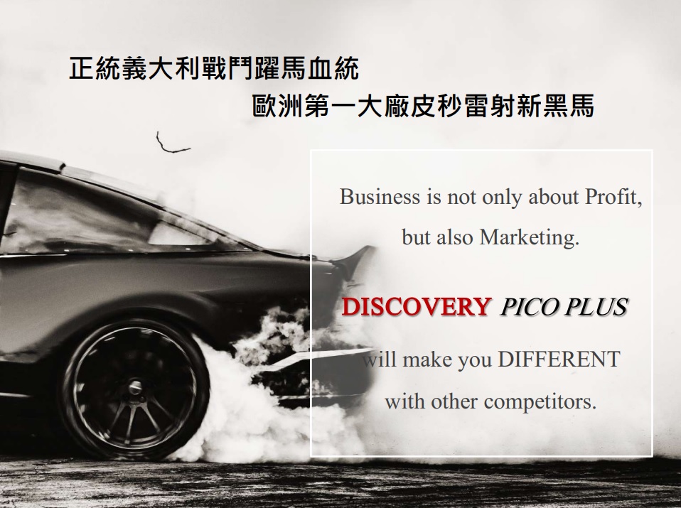 男人夢想 義大利頂級超跑 女人愛用 義大利探索皮秒 所以,若將淨膚雷射比喻為一台馬車,皮秒雷射顯然相當於一部法拉利跑車。