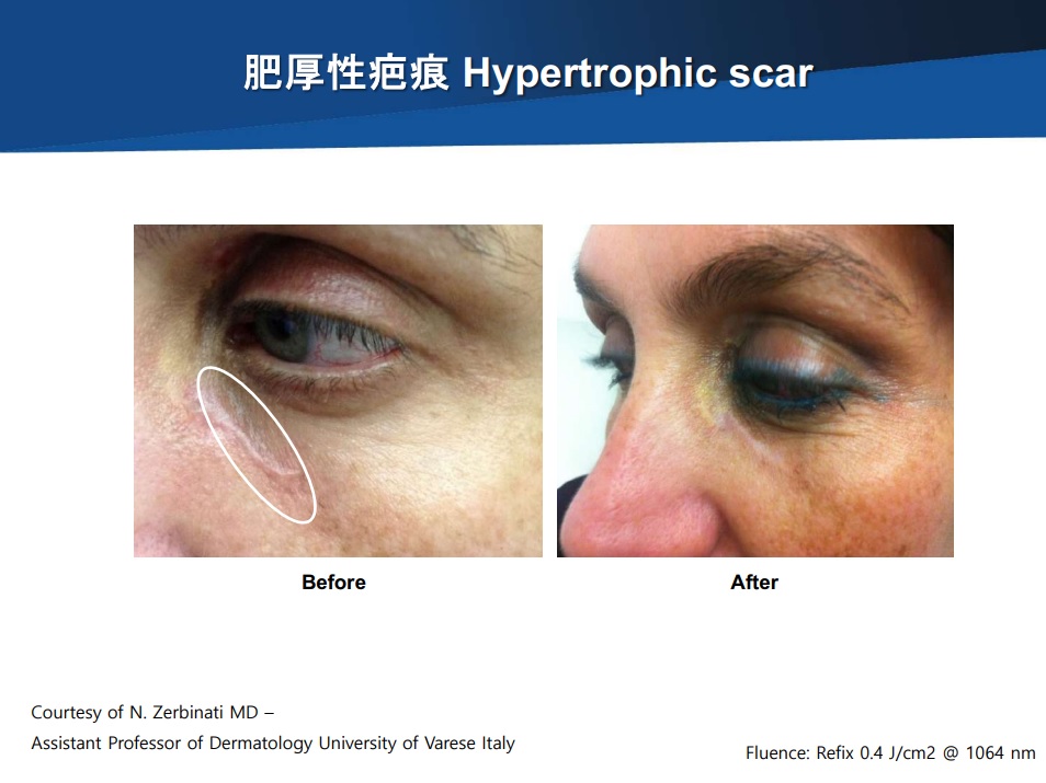 疤痕美型術: ReFIX超級鏡片讓皮秒雷射瞬間多點聚焦的優勢,讓機械光效應可在皮下真皮層創造「 光剝離(Laser Subcision)」效果,將把拉扯表皮的疤痕纖維化組織鬆開,對滾動型痘疤或萎縮性疤痕修正效果佳。再數次療程後,能讓皮膚自然膨出完整,達到改善。 該如何有效治療疤痕組織?