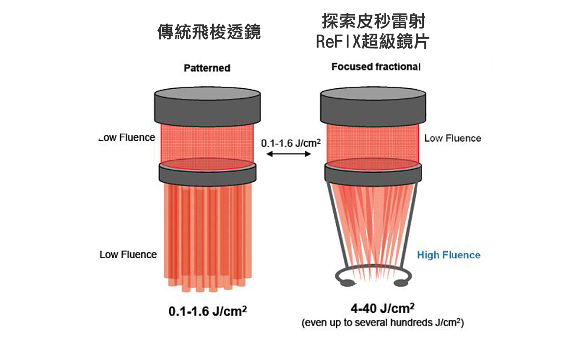 藉由ReFIX超級鏡片的聚焦科技,探索皮秒的能量可被放大24倍,且穿透深度直達2mm,改善膚質如虎添翼。 以過去讓飛梭雷射一籌莫展的眼周嘴角細紋為例,探索皮秒只要打個兩三次便出現令人滿意的效果,而且不易出現反黑的副作用,適合亞洲人的體質,是台灣皮膚科醫師的最愛。