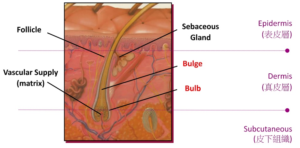 Bulb/Bulge為提供毛髮生長所需養分的主要部位, 由毛幹吸收雷射光所產生的熱能, 需有效傳達至Bulge/Bulb才能達到永久除毛的功效.