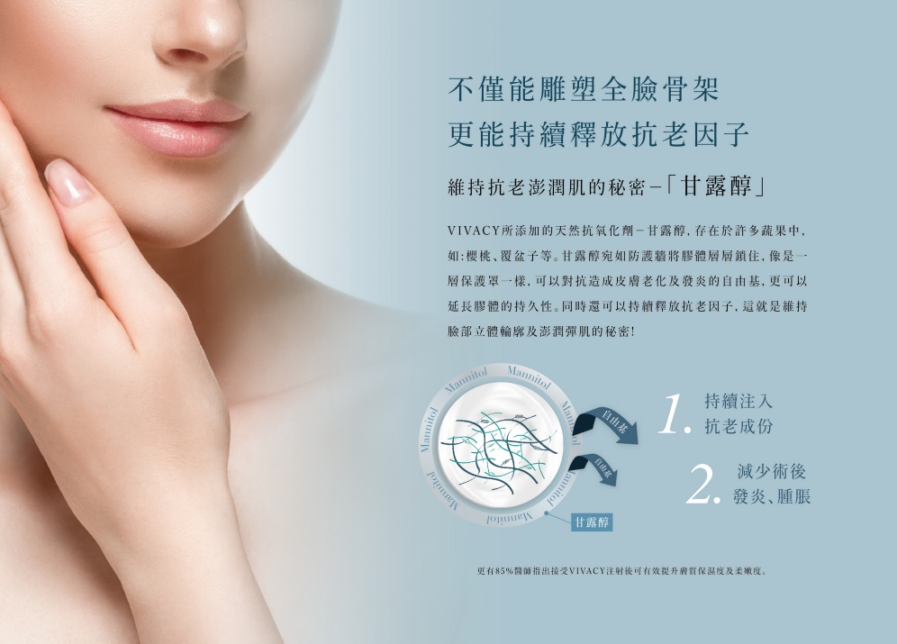 自由基是肌膚產生皺紋鬆弛乾燥的主要元兇,有了抗氧化甘露醇的保護,使得 VIVACY 不僅可雕塑臉部立體輪廓,更可有效提升膚質保濕度及柔嫩度。
