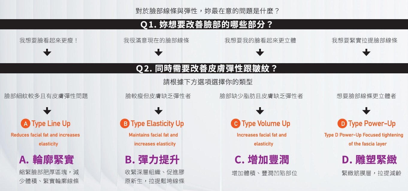 LINEAR Z「Z音波」 「Q+立線音波 的升級版,利用HIFU聚焦式超音波的「連續聚焦」技術,不僅可針對真皮層、淺層脂肪層與筋膜層,深度更可達深層脂肪層,滿足各式肌膚需求,改善臉部皮膚鬆、垮、垂等問題。治療更安全、低痛感也更快更有感!」