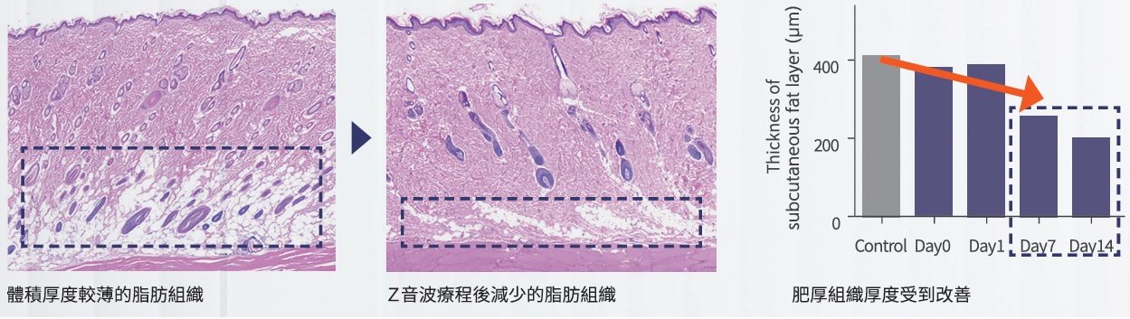 根據Z音波的研究文獻發現,Z音波的點狀和線性能量能使脂肪層逐漸變少,同時,正確使用點狀與線性模式能量,更可以改善皮膚組織內微環境,促進彈力蛋白和膠原蛋白增生。 1.脂肪組織厚度體積減少!