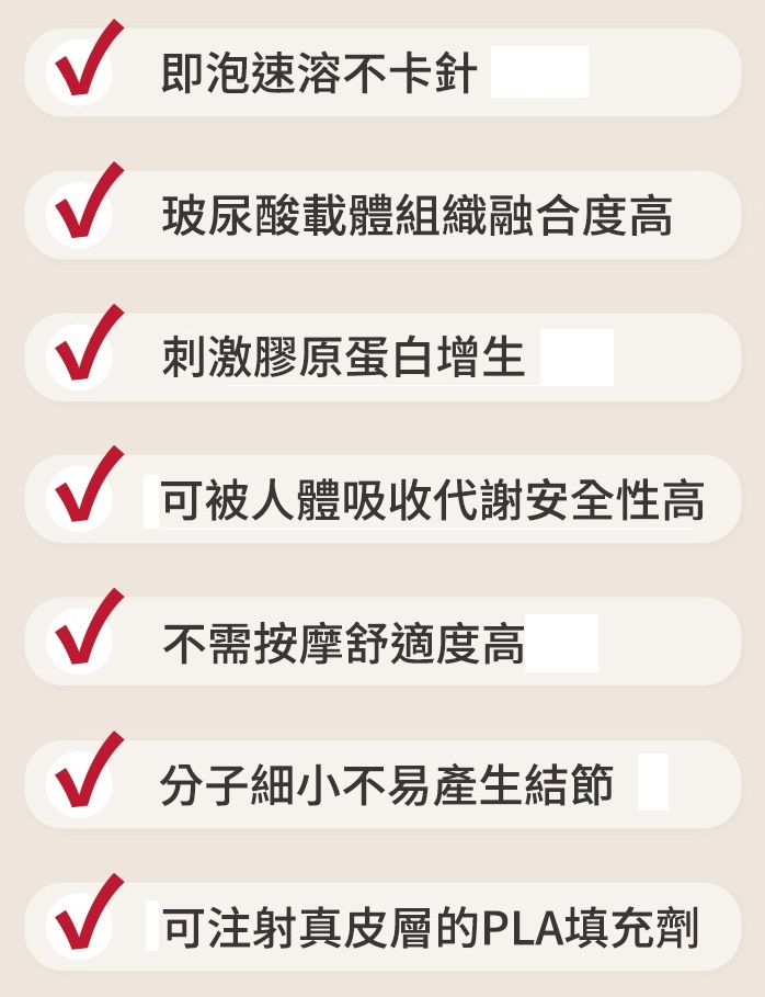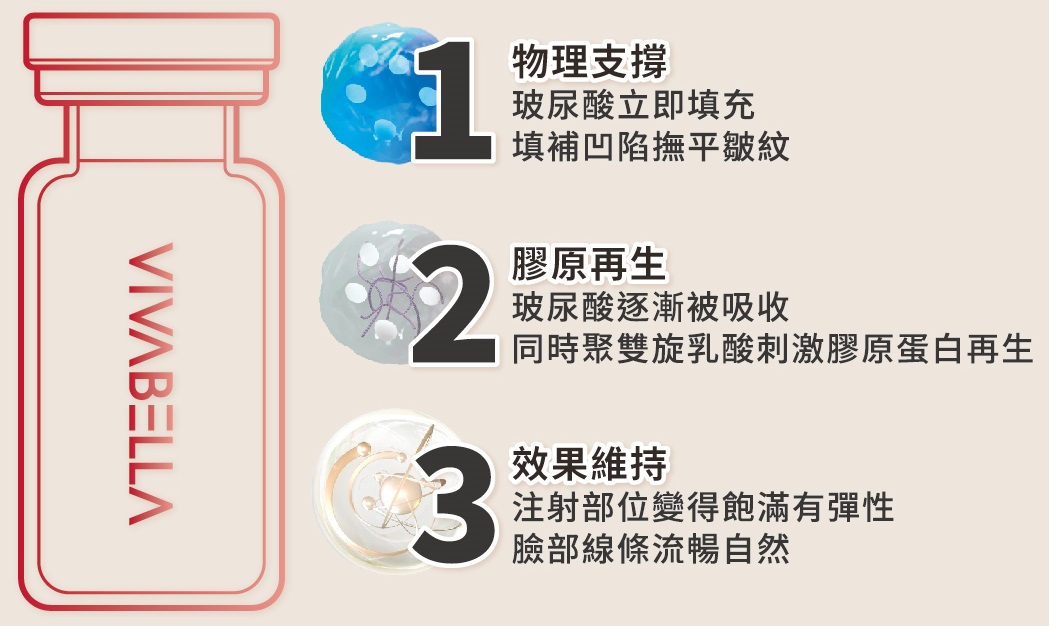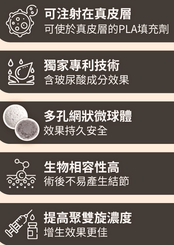 利用聚雙旋乳酸和玻尿酸兩種物質的優點,可以活化膠原蛋白,並刺激膠原增生,改善肌膚老化問題,填補凹陷、緊緻肌膚。