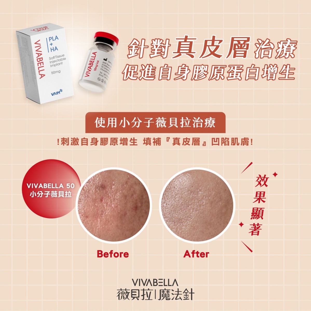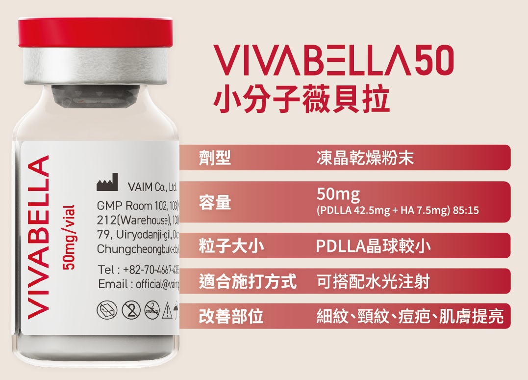 VIVABELLA 50 小分子 → 分子細小,可注射至真皮層,達到均勻吸收、溫和刺激膠原、提升肌膚水感與彈性