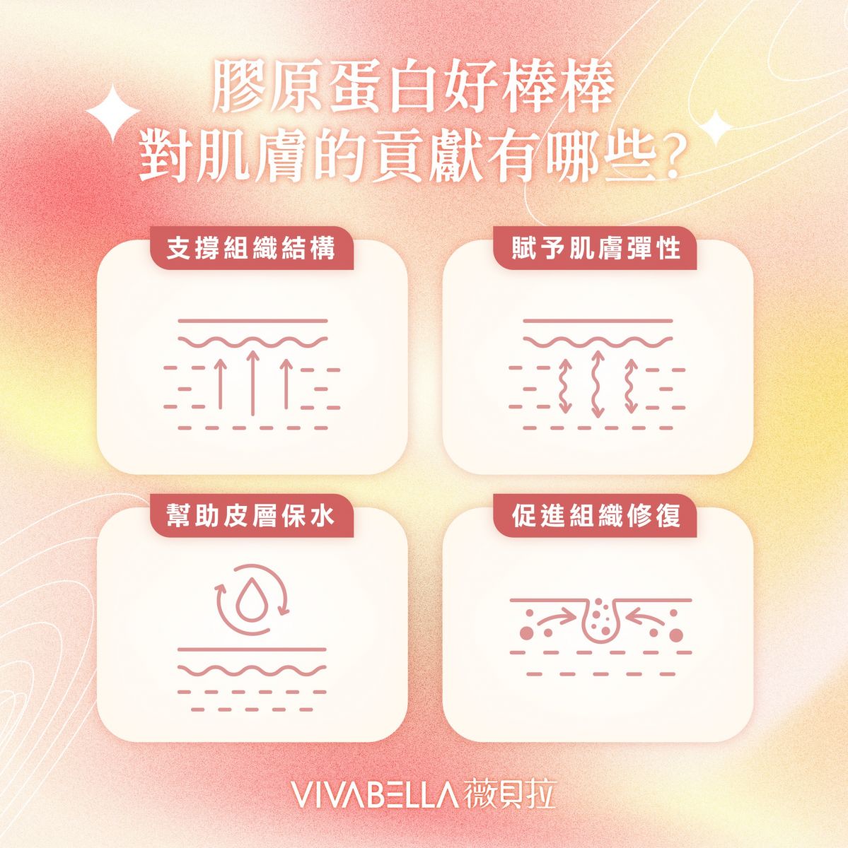支撐組織結構、賦予肌膚彈性緊緻、幫助肌膚保水保濕