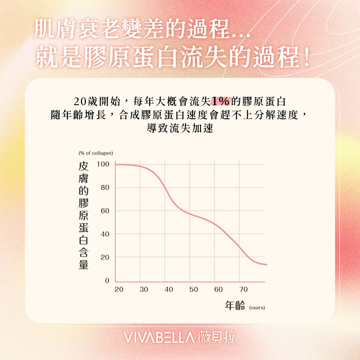 20歲開始 膠原蛋白會以每年1%的速度流失 且逐年遞增