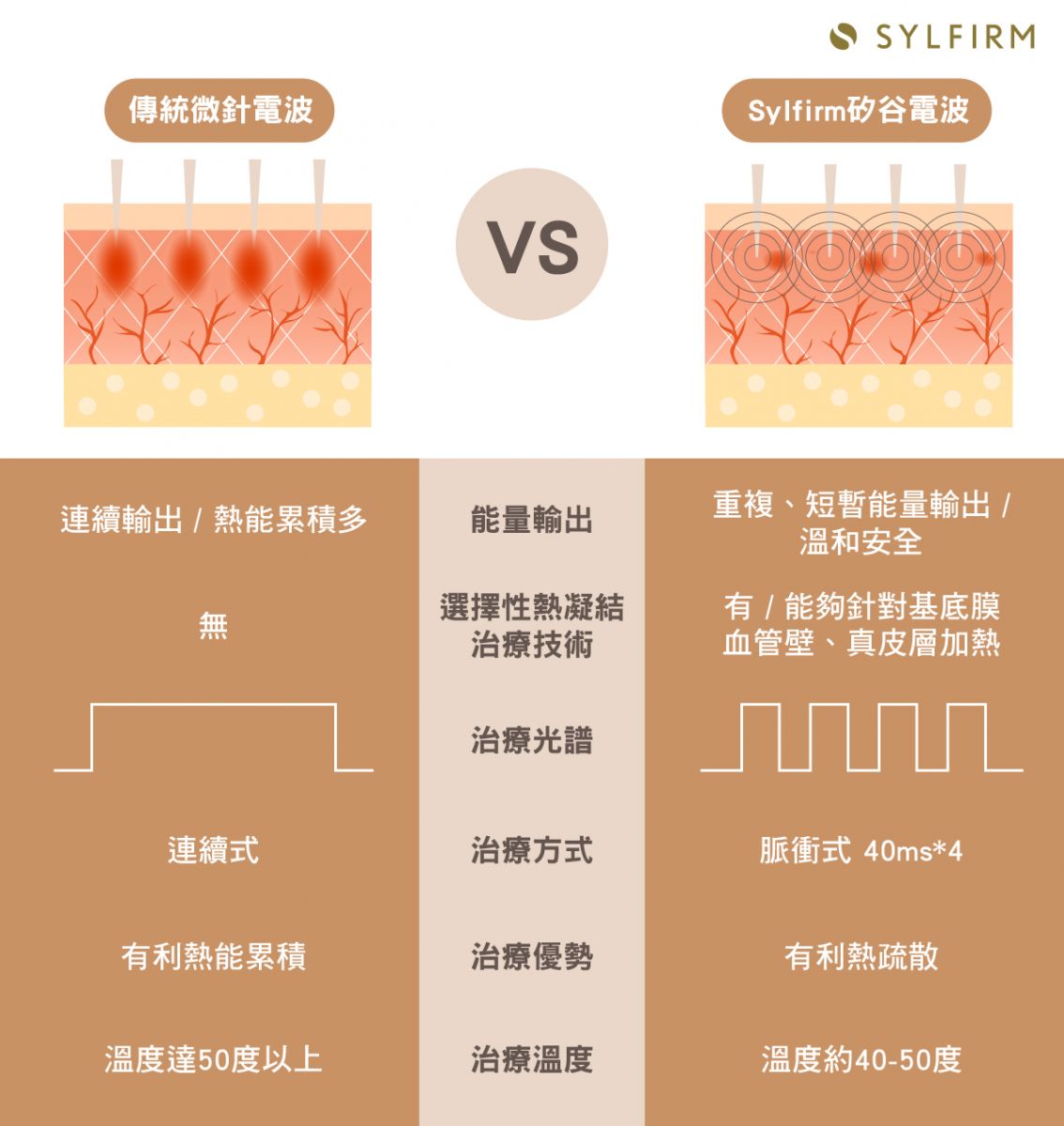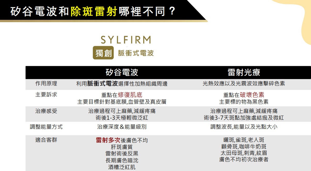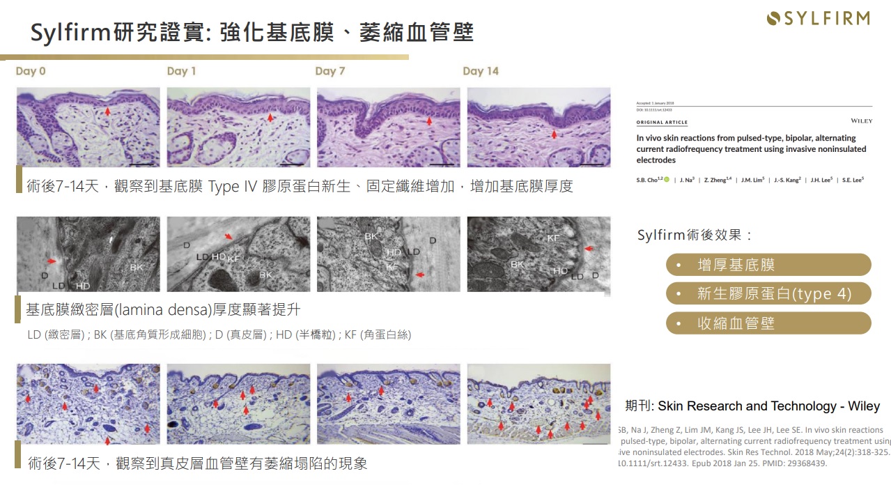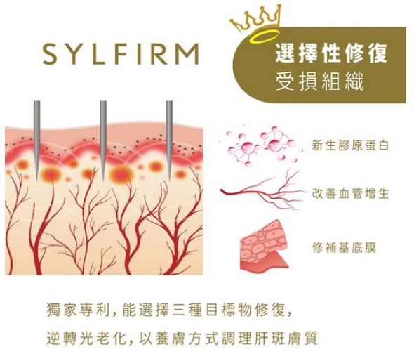「作用原理」 Sylfirm矽谷電波由美國矽谷研發團隊所設計,不同於傳統電波的「非選擇性」破壞,Sylfirm矽谷電波具備專利的脈衝式熱能輸出模式,可以「選擇性」讓熱能精準通過目標組織給予治療,像是基底膜、血管壁以及真皮層受損的纖維母細胞等,針對受損的皮膚組織進行修復,刺激皮膚的膠原蛋白新生。