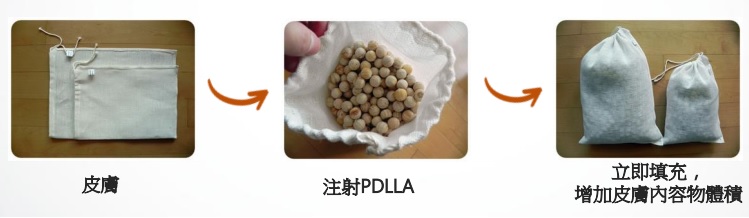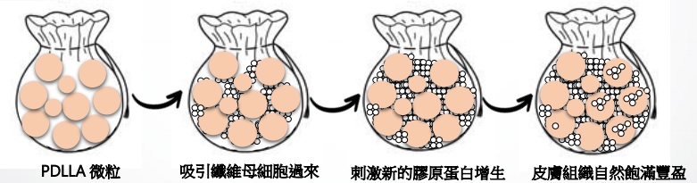 第二重作用:PDLLA 多孔性微球體,可吸引纖維母細胞進來,刺激自體膠原蛋白的增生。