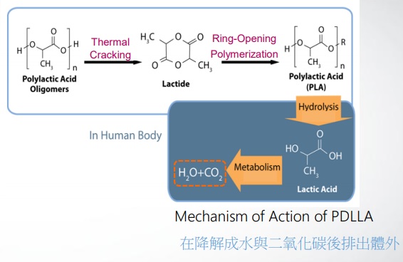 聚乳酸PLA (Poly-Lactic Acid)製程 利用從玉米和馬鈴薯等100%可再生資源中提取而合成的熱塑性高分子材料,長期使用於醫療的多個領域(注射劑、可生物降解的植牙、持續性供給藥物等),是一種安全的醫用材料。