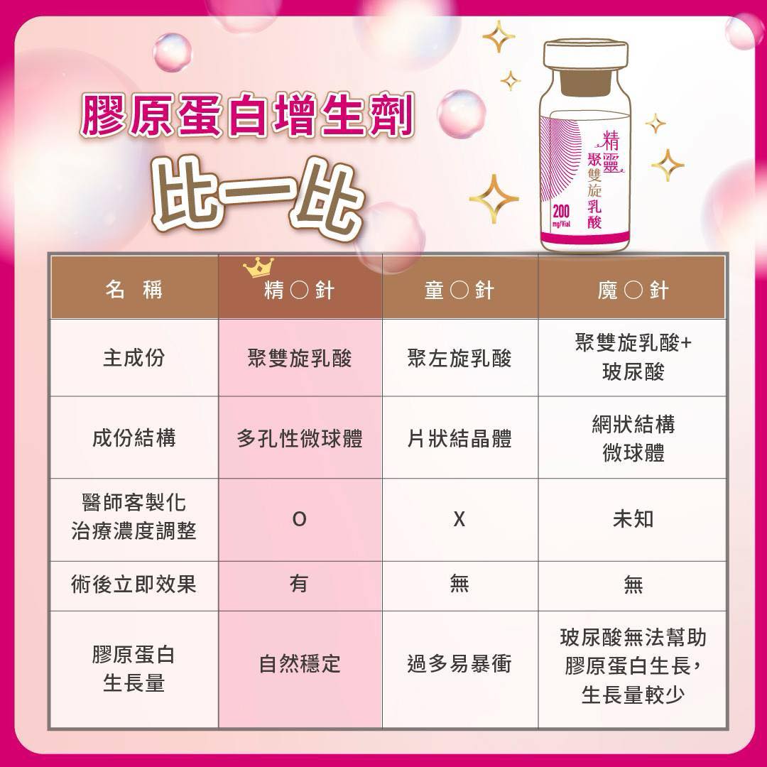 膠原增生劑 選「單旋」好還是「雙旋」好? 還是「雙旋+玻尿酸」更好? 近期盛行的膠原蛋白增生劑,具有刺激自體膠原蛋白新生的特性,能改善凹陷、皺紋等問題,達到整體面部持久澎潤的效果。 做為真皮注射的材料,目前市面上可歸類有三種不同的材質,有哪些特點?適合我嗎?挑選時又該注意哪些呢? 單旋類: 「聚左旋乳酸」;是最早開始使用的產品,此材質對膠原蛋白生長的刺激性過高,術後需搭配按摩使其均勻分布減少副作用產生;因其結構呈扁平片狀不具有立即支撐性,所以要等到治療後3~6 個月後自體膠原增生,才能看見效果。 雙旋類:「聚雙旋乳酸」:是穩定性高,速溶力強且肌膚相容性佳的材質,能減少術後肌膚結節或不平整的情況;多孔性微球體的立體結構設計,能作為膠原新生支架,提供肌膚柔軟自然地支撐力。醫師更可客製化調製濃度,低濃度調製可提供「漸進式刺激膠原蛋白新生」的效果;而高濃度調製可提供「立即填充」的效果,應用範圍更廣泛,消費者滿意度高。 聚雙旋+玻尿酸類:「聚雙旋+玻尿酸」材質,目前添加的玻尿酸容易被組織吸收而無預期之支撐力,刺激膠原蛋白生長的量在臨床上尚需觀察。 #膠原蛋白增生劑 #精靈針 #聚雙旋乳酸 #聚左旋乳酸 #聚乳酸結合玻尿酸 ![]() 精靈水光|煥發肌膚新感受 只靠保養還不夠? 多效合一,肌膚升級不是夢 選擇百搭靈活,百變運用: 特色成分加持 術後保養小提醒: 煥發肌膚新感受 ,與你的理想膚質更靠近一步! 常見問題 Q:什麼是精靈聚雙旋乳酸 ? Q:誰適合使用精靈聚雙旋乳酸 ? Q:精靈聚雙旋乳酸效果如何發展? Q:療程需要多少次?每次間隔多久? Q:何時可以看到效果?效果能持續多久? Q:何時需要回診? Q:注射後有哪些可能產生的反應? Q:術後居家照護應如何進行?