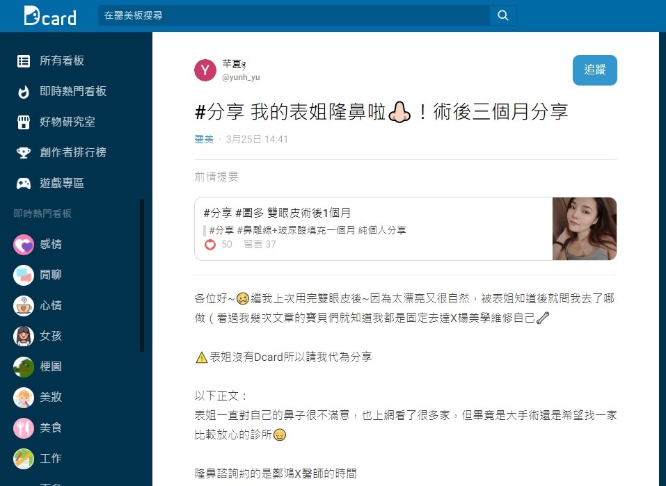 Dcard #分享 我的表姐隆鼻啦!術後三個月分享