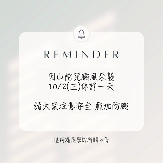 10/2(三)【休診公告】 因應山陀兒颱風來襲,明日休診一天! 原先預約之顧客請私訊客服調整時段! 造成不便敬請見諒,請大家嚴加防颱!