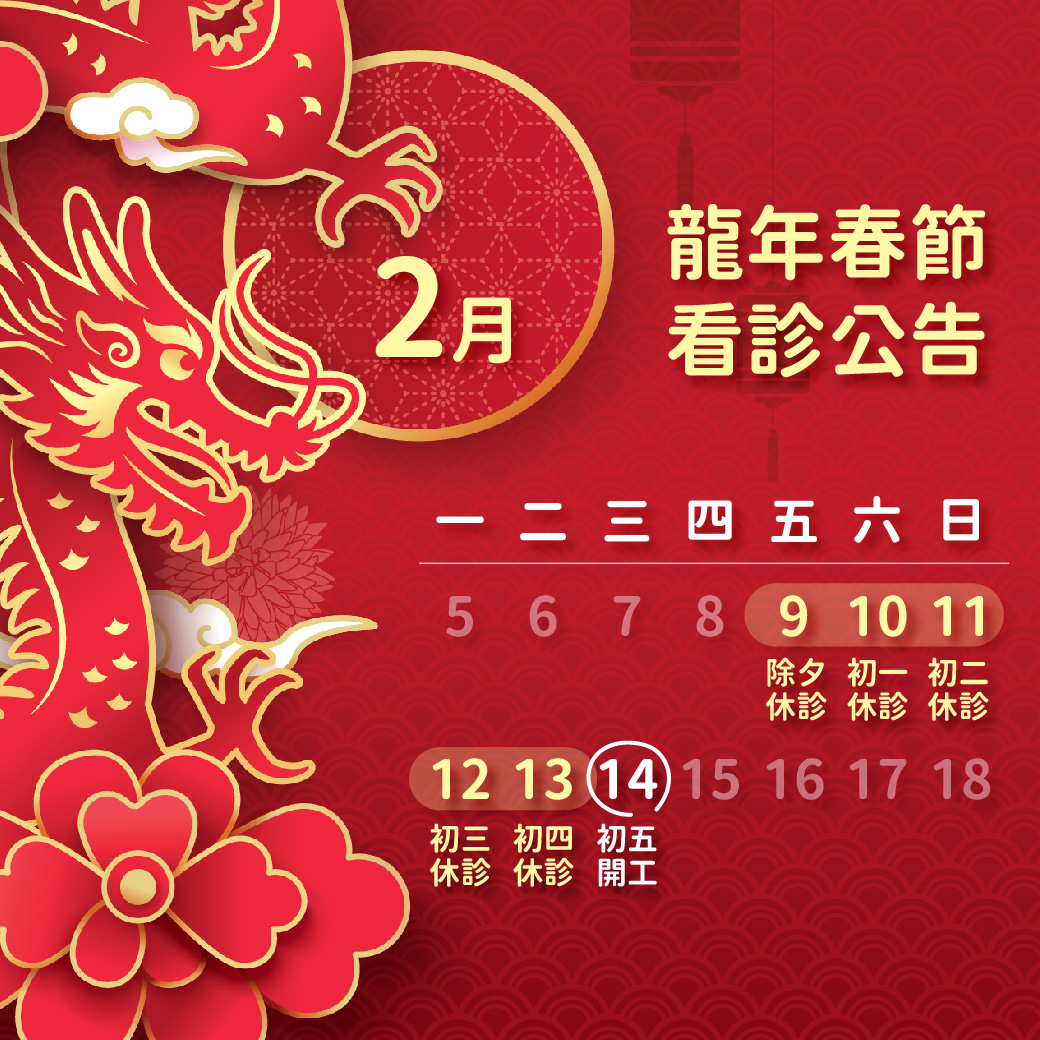 2/9(五)除夕:開始休診~2/13(二)初四,